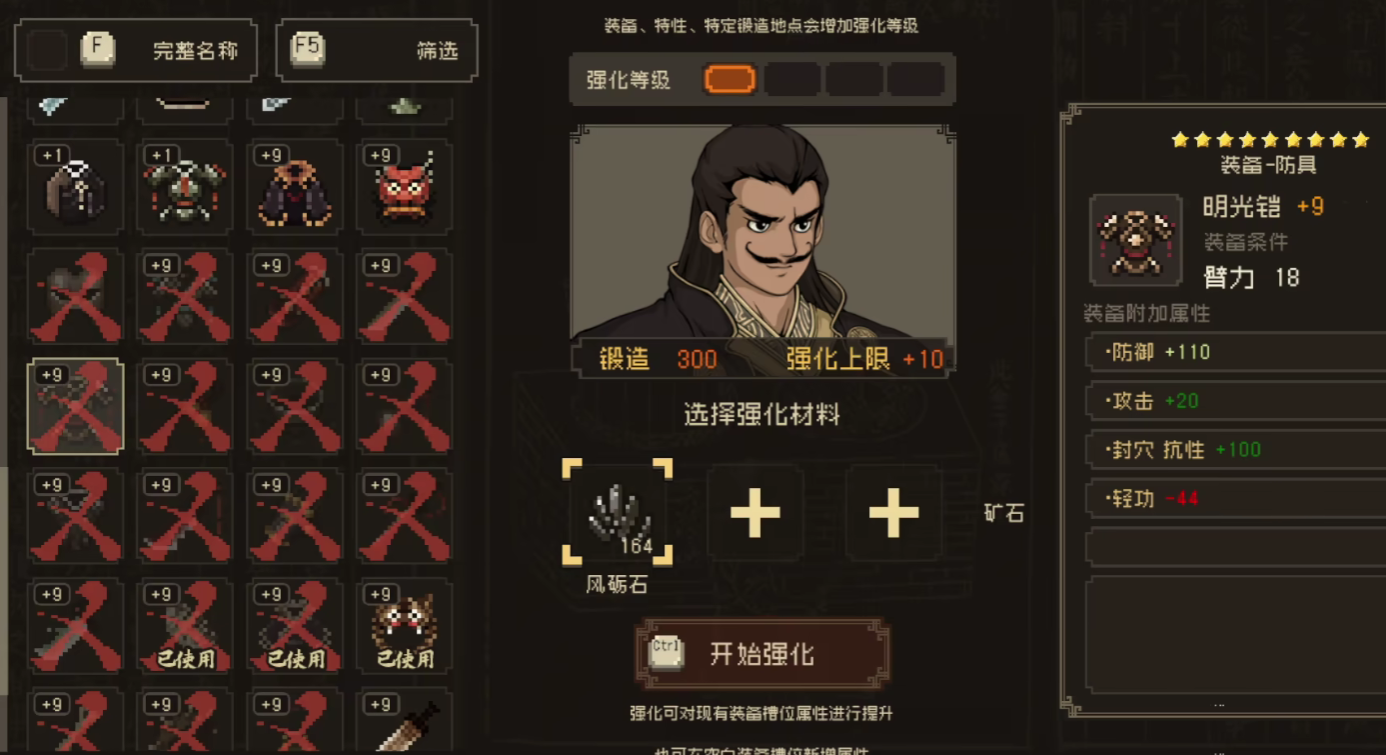 防御装备的选用上面,明光铠是游戏内最强的防御神器,玩家如若想要获得明光铠,在游戏内只能通过强化普通铠甲的方式,将其升级为明光铠,最终进阶成为大宋明光铠,这需要消耗玩家大量的材料,但是明光铠的防御效果极佳,能够增加270点的防御数值,并且封印抗性为3554点,在游戏内是T0级别的防御装备。