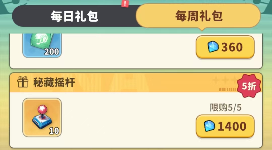 每日礼包必换项:免费体力、招募令、秘藏摇杆(钻石不足时优先6折兑换,充足则7折与6折同步入手)、锻造晶石(用于装备洗练)。