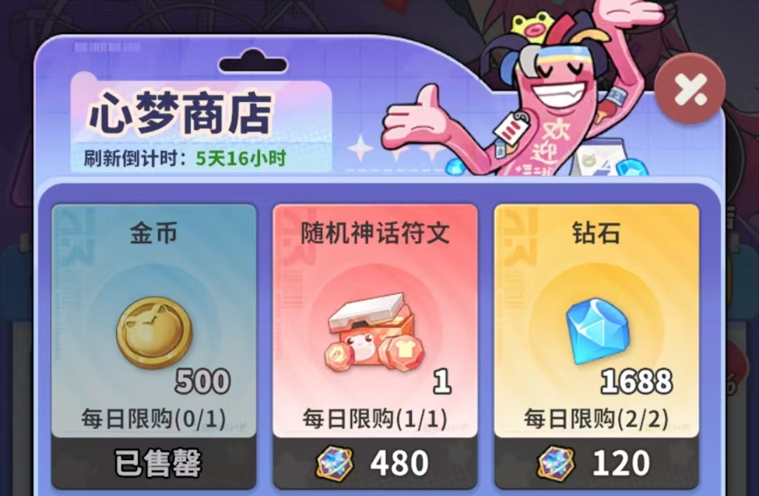 心梦宝石唯一获取途径为每日特惠礼包,因此该资源主要服务于中氪及以上层级玩家。兑换优先级排序如下:随机神话符文>钻石>幻梦晶核>梦境招募劵>秘藏摇杆>其余道具。