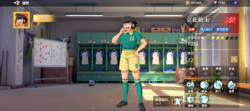 立花政夫在游戏中同样定位为前锋,并可与边锋位置互换使用。通常情况下,他常与立花和夫一同登场,因两人是“双人射门”组合的核心成员。在防守反击方面,他的表现不逊于立花和夫,甚至综合评分高出2分。在技能机制上,他的基础长传能力更为优异,若未受到对方抢球干扰,可额外获得15%的长传属性加成,显著提升传球效率。此外,在执行突袭类技能进行抢点时,他具备“高空飓风”这一特殊能力,使其在空中对抗中占据明显优势。
