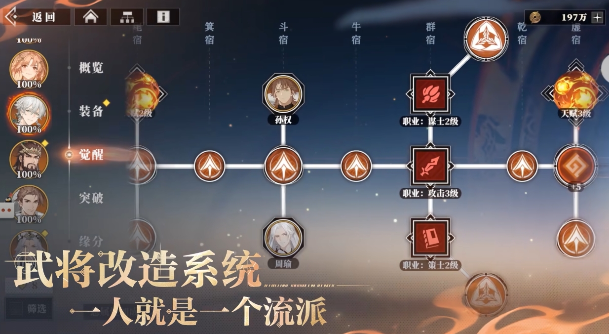 游戏秉承三军无废将的理念,致力于为每一位玩家打造公平且富有挑战性的游戏环境,在这里所有角色都有平等的升阶机会,都可以一路成长至SSR级别,彻底抹平了数值上的差异,全新的武将改造系统闪亮登场,这些各具特色的武将相互配合,构成了一个丰富多彩、充满变数的战斗体系,每个角色都不可替代,都能在战场上发挥出关键作用。