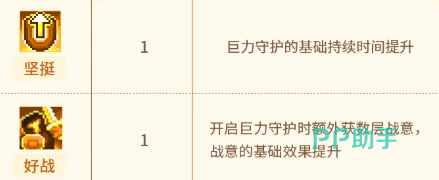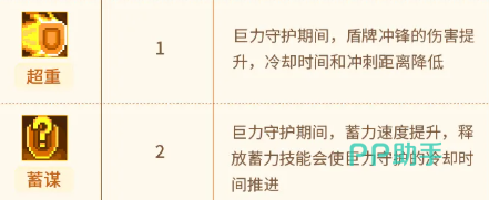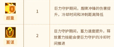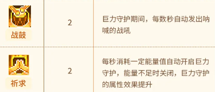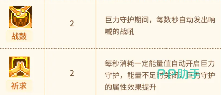 第4项【蓄谋】加快技能蓄力速度,并在释放蓄力技时主动重置“巨力守护”的冷却计时; 第5项【战鼓】使角色在守护持续期间,每隔固定秒数自动触发一次范围战吼效果; 第6项【祈求】开启能量自动管理机制——每秒恒定消耗能量值,当能量充足时自动激活“巨力守护”,能量不足则自动关闭。