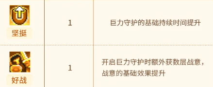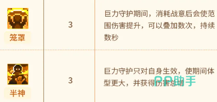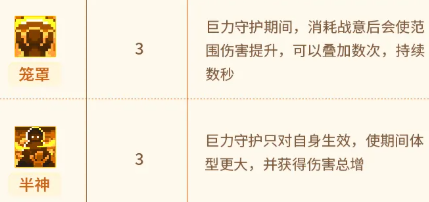 第7项【笼罩】允许在技能发动过程中,主动消耗战意层数以提升范围输出能力,该效果支持多层叠加; 第8项【半神】将“巨力守护”的作用对象限定为自身,同时带来体型增大效果及全局伤害总增益。