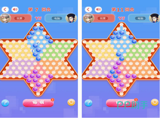 这款游戏支持2~6个人共同畅玩,所以三个人玩也是可以的,在每次玩的过程中,你需要选择自己喜欢的颜色棋子,然后通过每隔一个棋子,不断跳跃的方式,尽快的到达对面的位置,就可成为获胜者。在三个人玩的时候,只有两个人能获得胜利,最后一个玩家,就属于失败的一方,所以想要获胜的话,你要了解游戏的规则,还支持悔棋。