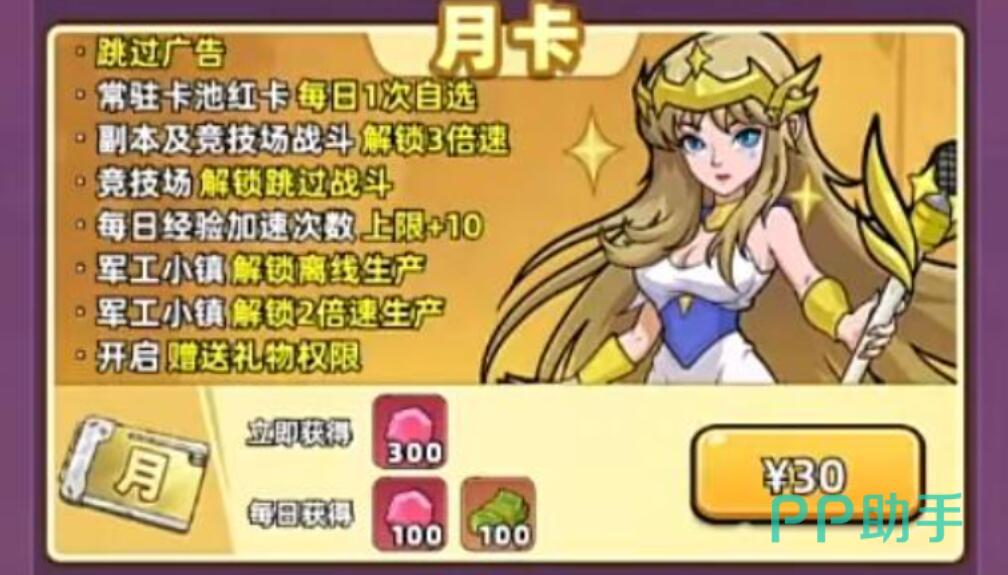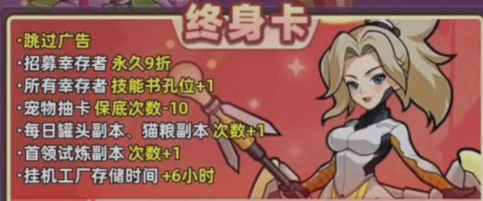 若以长线运营为目标,订阅类卡牌体系更具可持续性优势。周卡侧重资源获取效率:每日钞票掉落上限提升至1000点,野外角斗凭证积累速度加快,并额外提升挂机工厂产出。月卡则强化战斗与成长双维度:常驻卡池虹卡每日自选1次,加速核心阵容成型;竞技场与副本挑战次数解锁三倍上限。终身卡为一次性投入方案,永久生效,涵盖广告跳过权限、幸存者招募9折优惠,并持续发放钻石、技能书等长效培养资源,长期综合收益最高。
