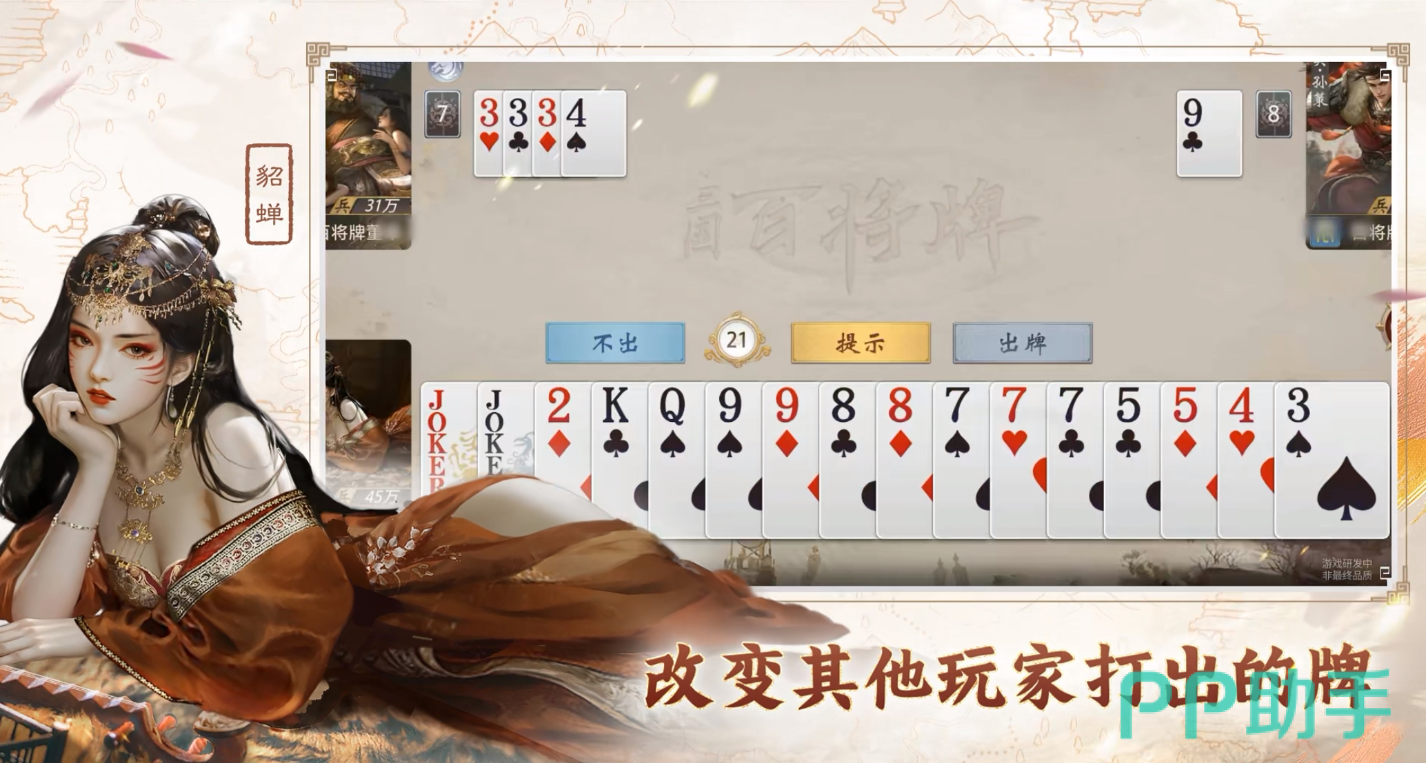 游戏采用极简上手设计,单局时长严格控制在约三分钟,适配移动场景下的碎片化娱乐需求。核心规则延续斗地主逻辑:率先出完手牌者获胜。但胜负关键在于“技能驱动式出牌”——每位武将携带唯一主动技,可在出牌阶段触发,实时干预牌型结构。例如关羽技能支持两种选择:抽取一张万能牌,或从任意对手手中强制获取一张手牌,显著提升顺子、连对等组合的构建效率与容错空间。