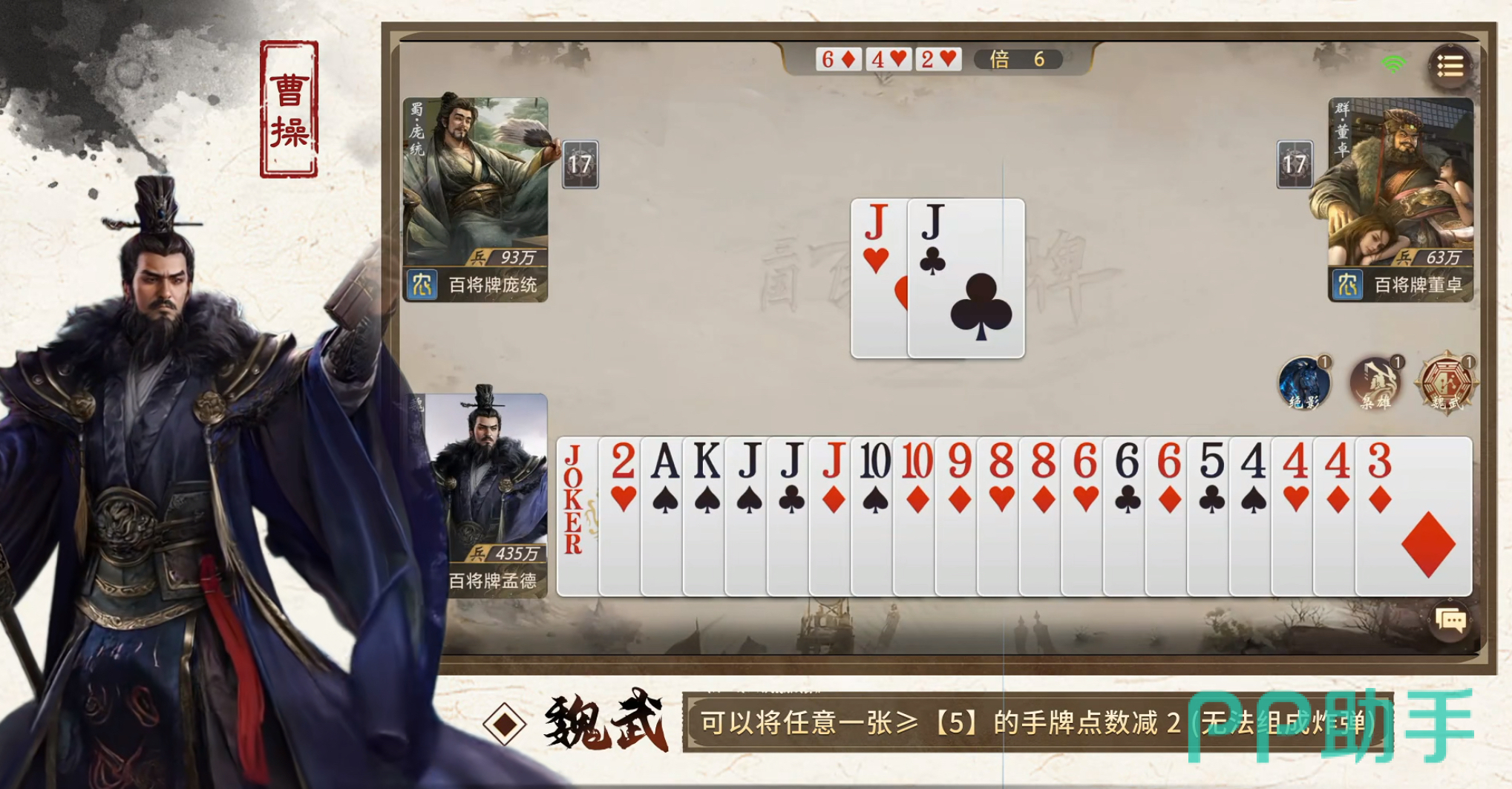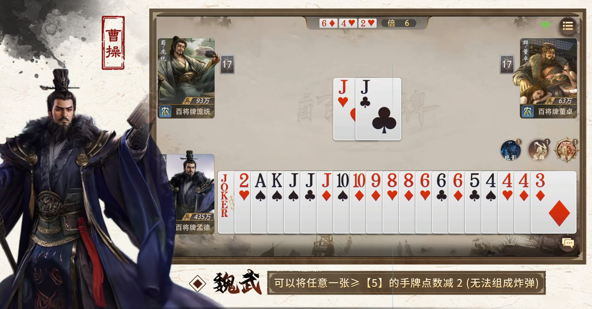 技能系统构成游戏深层博弈维度。它不仅是辅助工具,更是攻防转换的核心变量:玩家既需预判自身技能释放时机,也要警惕对手利用技能拆解关键组合、打断连招节奏。地主身份引入三方动态平衡机制——农民协作压制与地主反制突围形成策略张力。此外,“名马”系统作为独立技能模块,可二次改写手牌属性,部分武将与特定名马组合后,甚至能实现残局逆转、绝地翻盘的战术效果。