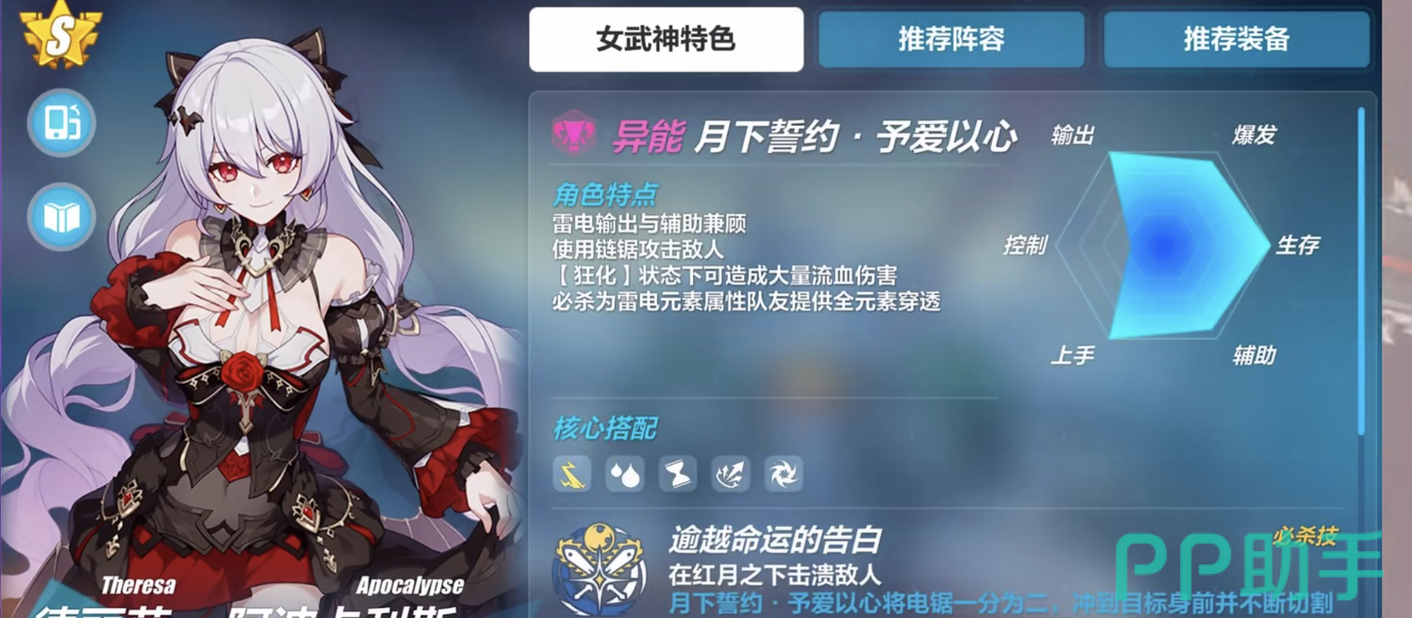 最后就是死生之律者,这也是一位一线高手哦!她的武器是一把镰刀,并且死律拥有塑灵形态和结命形态两种形态,这两种形态下的死律是分别拥有不同的能力,在塑灵形态下的死律定位接近辅助,可以通过必杀技和连携攻击为全队提供buff,比如爆伤加成、能量回复以及全伤害加成等等各种增益buff;另一种形态就比较接近输出形态,不仅伤害高而且对于机械类型的强敌拥有额外的增伤,可以说绝对是T0级别的角色,推荐指数五颗星哦!