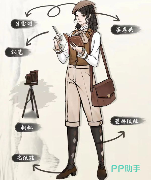 她在游戏中的标志性形象令人印象深刻:头戴贝雷帽,留着卷曲有致的蛋卷头发型,脚穿菱格纹袜搭配高跟鞋。随身携带一支可自由流动墨水的钢笔,以及一台柯达布朗尼相机——这款相机支持快速更换胶卷,成本低且操作便捷,完美契合她频繁外出拍摄的需求。
