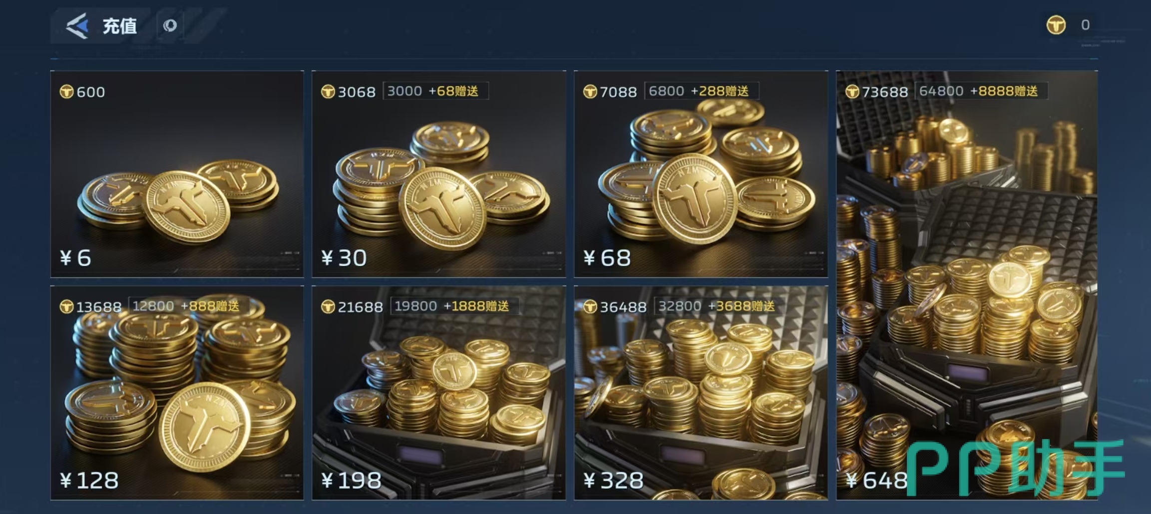 NZ点的基础兑换比例为1元=100点,即6元可获得600点NZ点。在此基础上,系统设有累进式充值加成:单笔30元充值可得3068点(含68点赠送);68元档位对应7088点(含288点赠送)。整体呈现“充得越多、赠得越优”的策略逻辑,有效提升高额度充值的单位价值密度。