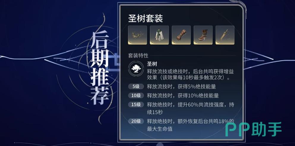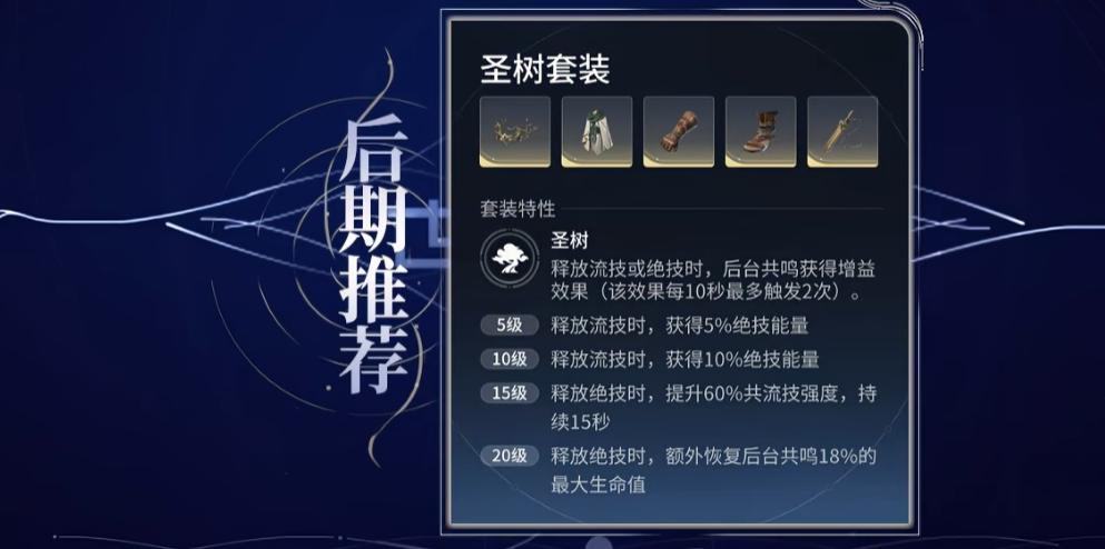 前期推荐使用“魅影套”过渡,侧重提升治疗强度与大招充能效率;后期可切换为“圣树套”,在释放大招时为后台共鸣角色提供额外绝技能量与生命值加成,与孙膑二技能的能量流转机制高度契合。