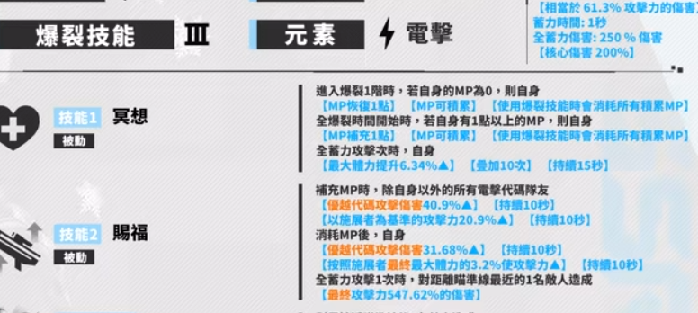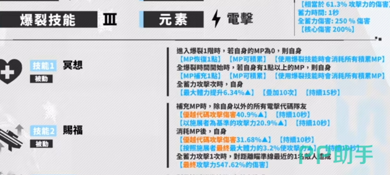 1技能拥有被动效果,能够为本身提供mp的回复,在进行技能释放的时候会消耗所有的mp。不过在技能释放的时候有原始的mp值,还会添加mp值的补充。在进行蓄力平a攻击,叠加10的体力值回复能够持续十几秒。