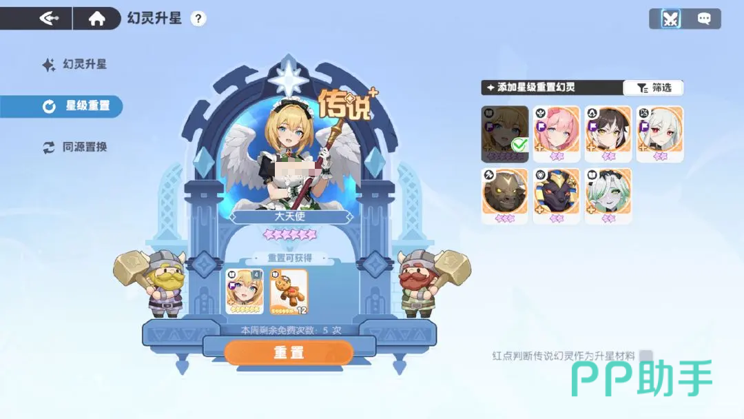 第二类为标准重置,分为两个独立模块:其一为养成重置,无次数限制,随时可返还全部经验药水、突破材料、技能升级资源等,操作后角色等级、技能等级、突破阶段均恢复至初始状态;其二为星级重置,每周限用五次,用于还原幻灵当前星级并返还对应升星材料。