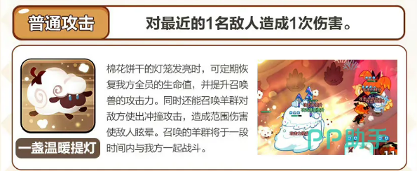 棉花饼干的普攻名为“一盏温暖提灯”,可对最近一名敌方目标造成单体伤害。该技能本身输出有限,真正核心在于“提灯点亮”后的持续效果:进入发光状态后,棉花饼干将周期性为全体友方单位恢复生命值,并同步提升我方所有召唤兽的攻击力。这两项增益在召唤队构建中具有战略级意义,直接关系到续航稳定性与爆发节奏。
