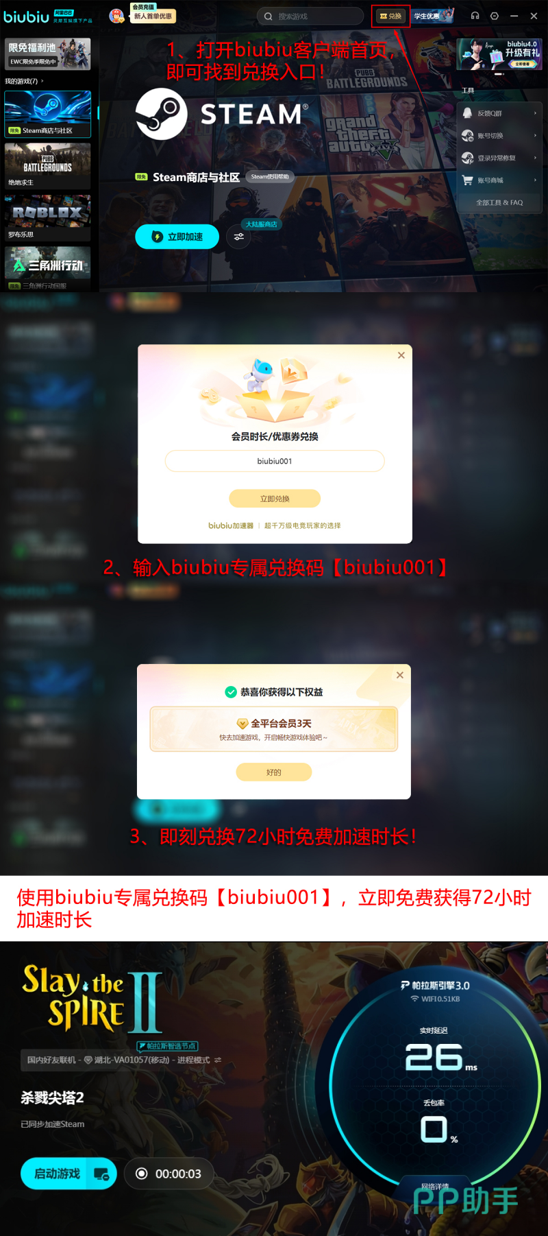 目前平台开放限时福利:输入兑换码【biubiu001】即可领取3天免费加速时长;新注册用户额外享有24小时专属礼包。两项权益叠加后,新手玩家最高可获得96小时无门槛加速服务,全程覆盖开荒全流程。