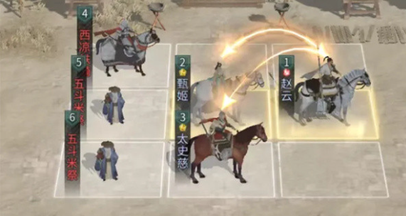 站位设计需严格遵循追击链逻辑:赵云必须置于太史慈的追击格内,同时与甄姬互置对方追击格,确保三人技能可高频联动。兵种配置上,前排末端推荐部署西凉铁骑,强化前排抗压能力;太史慈与甄姬身后各配一名五斗米祭,承担治疗、减伤与负面状态清除职能,保障队伍续航稳定性。技能搭配为固定组合,不可替换:甄姬必带【凌波微步】(主动+被动),兼顾团队回血与全队闪避增益;太史慈主攻群体伤害并施加【溃逃】debuff,令敌方每回合初自动损血,进一步放大赵云反打环境优势。
