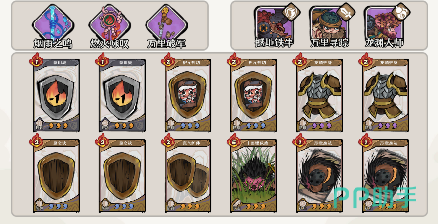 神兵搭配优先选择烟雨之鸣(每回合稳定抽2牌)、燃火咏叹(释放后回复3点怒气)、万里破军(为全体友方附加1层护甲)。卡组构筑围绕“护甲生成—怒气管理—节奏维持”三大目标展开:核心卡包括泰山决(格挡时减少敌方1点怒气,延缓关键技能释放)、护元神功(施放后为自身加2层护甲并抽1牌)、龙鳞护身(单体加2层护甲)、昆仑决(单体加1层护甲且附带减伤)、形意身法(出牌阶段额外使用1张卡)。备选卡牌如混元功(加1层护甲+抽1牌)、无中生有(抽2牌)、磐石功(加2层护甲)等,均可根据实际卡组厚度与资源分配灵活替换。