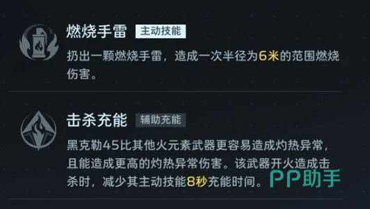 实战层面,该枪定位为高机动型近战输出单位。换弹速度优于同级冲锋枪,配合紧凑枪身结构,显著提升转点与贴脸作战响应效率。主动技能“燃烧手雷”具备6米半径范围伤害判定,适用于清场与压制场景;每次击杀目标可缩短技能冷却8秒,叠加灼热异常状态后,对集群敌人持续造成额外伤害,大幅优化副本刷图与资源积累效率。