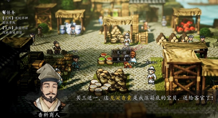 完成三味香料的全额购置后,系统将自动触发特殊对话事件。香料商人会向玩家致谢,并直接赠予“龙涎香囊”。此机制为隐藏交互,不依赖任务提示或UI高亮,因此需主动尝试完整采购流程。