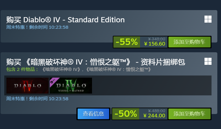 距离《暗黑破坏神4》首次上线已过去两年多,如今在秋促预热阶段,Steam平台已经推出了大幅优惠。目前游戏本体可享4.5折优惠,仅需156.6元即可购入,而包含“憎恶之躯”DLC的组合包则为5折,总价为244元。这两个价格均为该作发售以来的最低记录,属于值得入手的黄金时机。