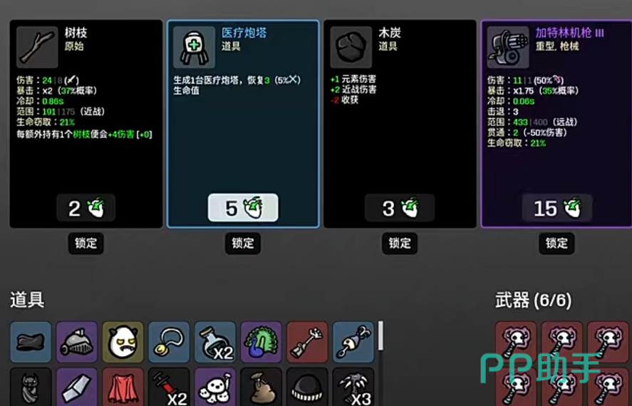 第1至第5波为筑基期。此阶段若遇低价【+生命值】类道具(如小血瓶、生命药剂),务必优先购买。前期血量基数越大,可支配的“血币”越多,容错率越高。武器推荐电击枪与幽魂节杖组合:前者提供稳定范围伤害与清怪效率,后者赋予持续回血能力,显著降低早期暴毙概率。