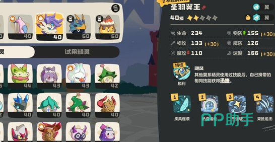 阵容配置建议采用三翼系精灵协同结构,以最大化触发【飓风】被动。蓝鸟、斑鸠、皇家狮鹫均为优选,三者基础速度值高,能快速释放异系技能,为圣羽翼王提供稳定迅捷来源,同步加快全队行动节奏。辅助位首选圆号鱼,其【湿润印记】可降低敌方全体技能PP消耗,有效打断对手技能循环节奏;若遭遇高频毒伤阵容(如毒藤蔓+剧毒蔷薇组合),则推荐替换为魔力猫,利用其伤害吸收机制构筑团队生存缓冲带。