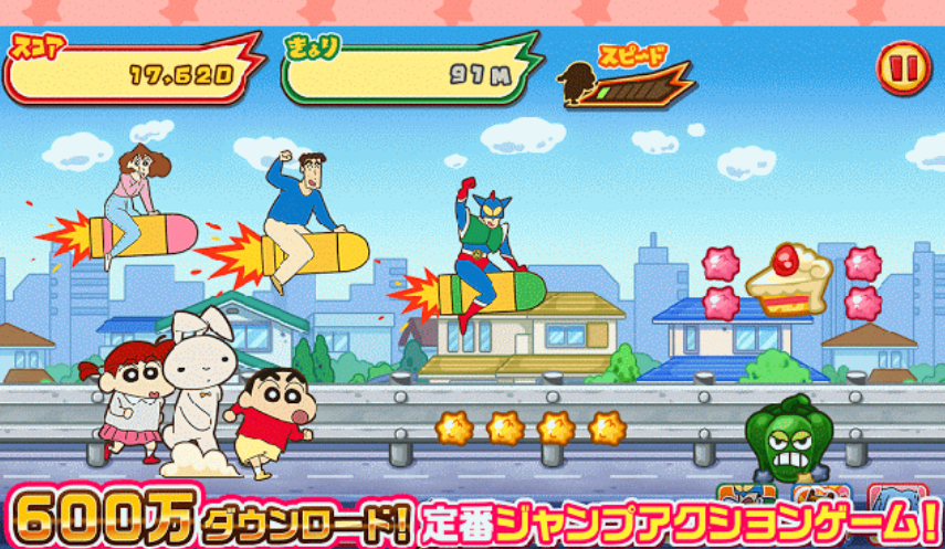本作是款拥有卡通风格表现的横版跑酷类单机作品,操控蜡笔小新中的角色进行跑酷喜感十足,冒险过程危机四伏有着许多危险需要躲避,萌萌的音效跟蜡笔小新的造型相辅相成,日系风格的背景呈现致使整体气氛更为温馨,跳跃躲避障碍的基础操作尤为简便,化身蜡笔小新跑酷闯关的流程也激情四射。