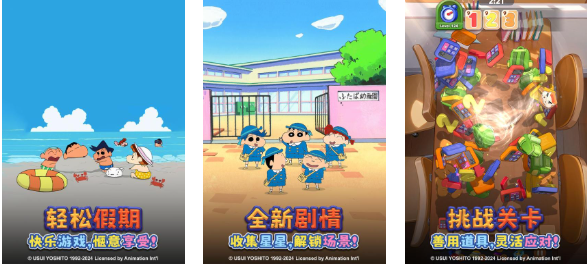 本作是款极其受欢迎的日漫卡通风格休闲益智作品,游戏呈现精美日漫UI跟细腻呈现的角色,经典的蜡笔小新剧情和地图设定都是亮点,你将以蜡笔小新的身份挑战不同角色获取资源,甚至可以在家里做家务或者与NPC互动,超级高的互动性和萌系的视觉效果都令人着迷,化身蜡笔小新感受游戏时光的感觉也很温馨。