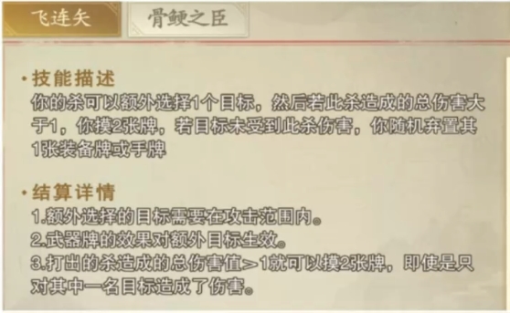 这里需要强调的是,即使仅仅对其中一个目标造成了超过1点的伤害,这个摸牌效果也会正常生效,从整体来看飞连矢这个技能的强度是非常高的,仅仅是能够额外选择攻击目标这一项特性,就已经让敌方玩家感到非常困扰和难受了,更何况还附带了可以额外摸牌或者是弃置牌的效果,而骨鲠之臣生效时,也有几个关键的要点需要注意,其中废除指的是使目标角色彻底失去其所拥有技能,这意味着该角色将无法再利用这个技能来影响游戏局势。