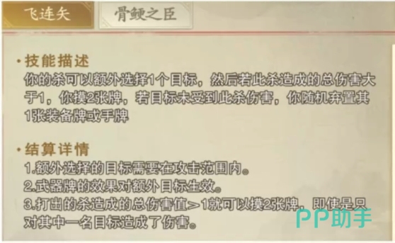当玩家在游戏中使用钟离眛的飞连矢技能时,需要特别注意额外选择的目标必须在自己的攻击范围之内,这就凸显了武器的重要性,它成为了关键道具,玩家一定要积极扩展自身的攻击范围,因为武器牌的效果对于额外选定的目标同样是生效的,这一设定为玩家在制定战略和规划攻击时增添了更多的考量因素,只要玩家打出的杀所造成的总伤害值大于1,就能够顺利摸取两张牌。