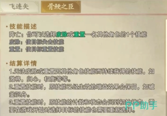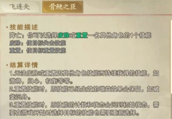 比如一些技能可能有次数限制或者是特定的状态标记,在重置后都将重新开始计算,此外这个技能存在一定的限制条件,即无法废除或者是重置那些因为其他角色技能而获取的技能,例如激将、归心等技能都是如此,这就要求玩家在使用骨鲠之臣技能时,需要精准判断敌方角色的技能来源,以避免出现误判或无效操作的情况。