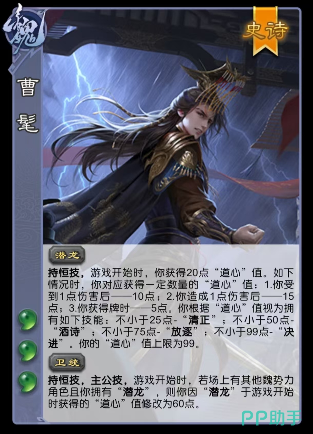曹髦拥有独立资源系统——道心值,上限固定为99点。开局即通过持恒技“潜龙”获得20点基础道心值。该资源可通过以下方式增长:每受到1点伤害+10点;每造成1点伤害+15点;每获得1张牌+5点。随着道心值提升,将按序激活四项持恒技:达25点解锁“清正”,达50点解锁“酒诗”,达75点解锁“放逐”,满99点激活终极技“决进”。此外,若曹髦为主公且场上有其他魏势力角色并已拥有潜龙,则初始道心值提升至60点,等效于开局即具备清正与酒诗双重能力。