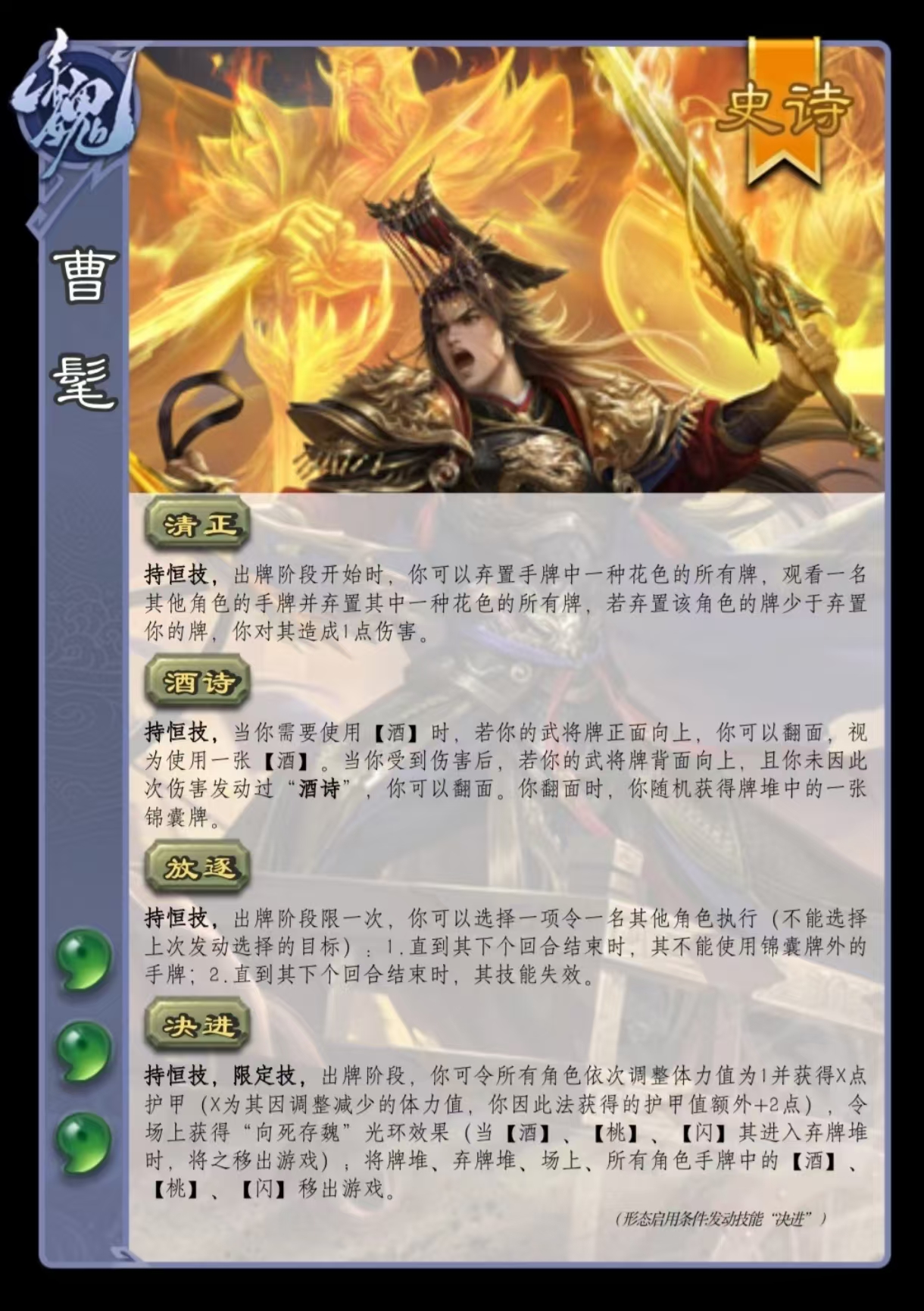 决进:终局决胜技,发动后全场角色体力上限与当前体力均调整为1点,且无法使用【桃】【酒】【闪】三类牌。此时所有角色仅能依赖护甲、技能效果或特殊判定进行博弈,而曹髦因额外+2点护甲,在此状态下具备显著生存优势。