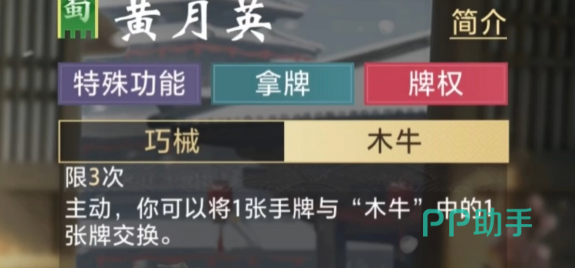 她的核心体系围绕“木牛流马”构建,被动技“巧械”赋予其资源积累能力:当对手打出对子或连对时,黄月英可从中择一张置入木牛,实现隐性手牌扩充。木牛容量上限为三张,因此玩家需持续评估场上节奏、预判对手出牌倾向,并动态规划木牛内牌的留存优先级——这既是限制,也是策略深度的来源。