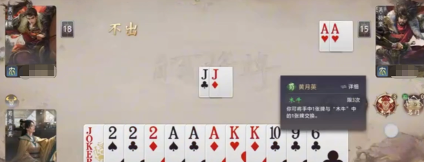 在不同对局模式下,黄月英的表现呈现明显差异。于斗地主类快节奏玩法中,“巧械”的高频触发使其易获取高点数牌或关键功能牌,配合“木牛”的精准调度,常可在地主轮次完成翻盘;若处于农民方或多人混战场景,则需压缩技能使用窗口,避免过早暴露意图,同时严控木牛存牌结构,防止因贪取低价值牌而丧失关键交换机会。