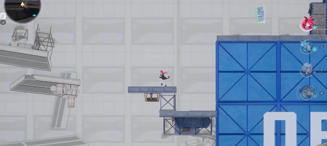 落地瞬间启用蓝色图纸进入2D状态,此后进入节奏化操作循环:上跳一格 → 切换黄色图纸旋转 → 上跳一格 → 旋转 → 如此往复。每次旋转均会重新定义重力方向与可落点,通过这种周期性空间校准,逐步攀升至建筑顶端。