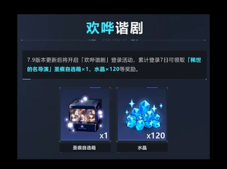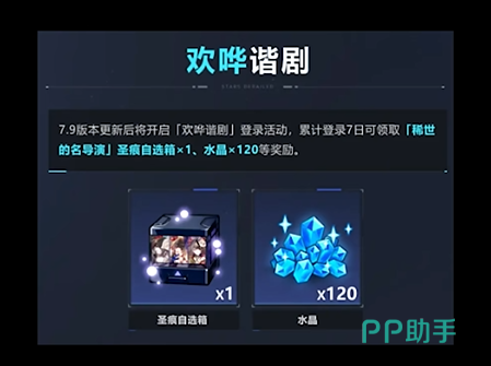 此次7.9版本中的欢哗谐剧活动,是一个为期七天的签到活动。只要每天登陆上游戏,再完成签到,大家就额可以免费获得一个圣痕自选箱以及120水晶。要知道圣痕自选箱可以让你在提升战力的路上事半功倍,再加上水晶奖励,实在是让人无法拒绝。
