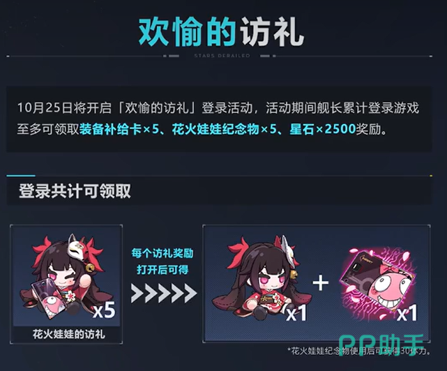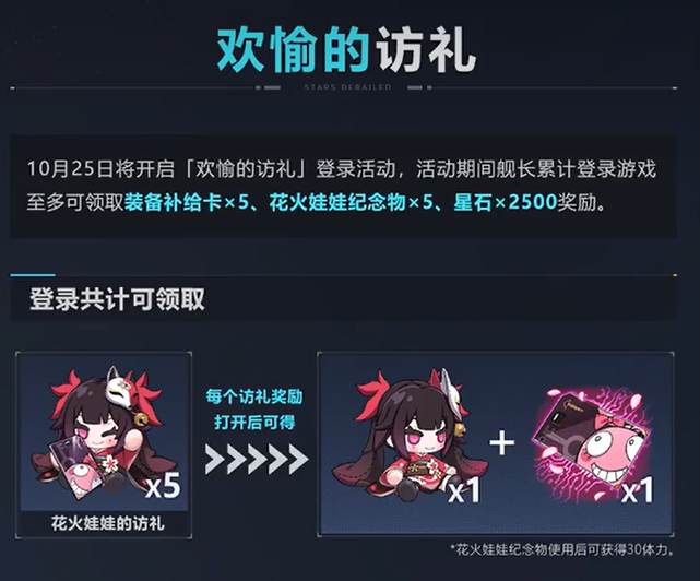 在活动开启的第一天,玩家上线后就会发现一项简单的每日登陆活动。只需要在活动期间每天登陆游戏,就可以领取到「花火娃娃的访礼」,兑换体力轻松无压力,每天30体力,积少成多,为后续的游戏内容做好充分准备。