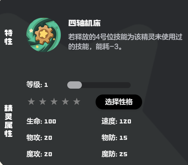机甲小子是由齿轮小子进化而成,属于机械系的精灵,这个种族的精灵的种族值只有475,种族值虽然不高,可是它的魔攻属性却非常高,它的生命值为92、物攻45、魔攻92、物防71、魔防90、速度85。