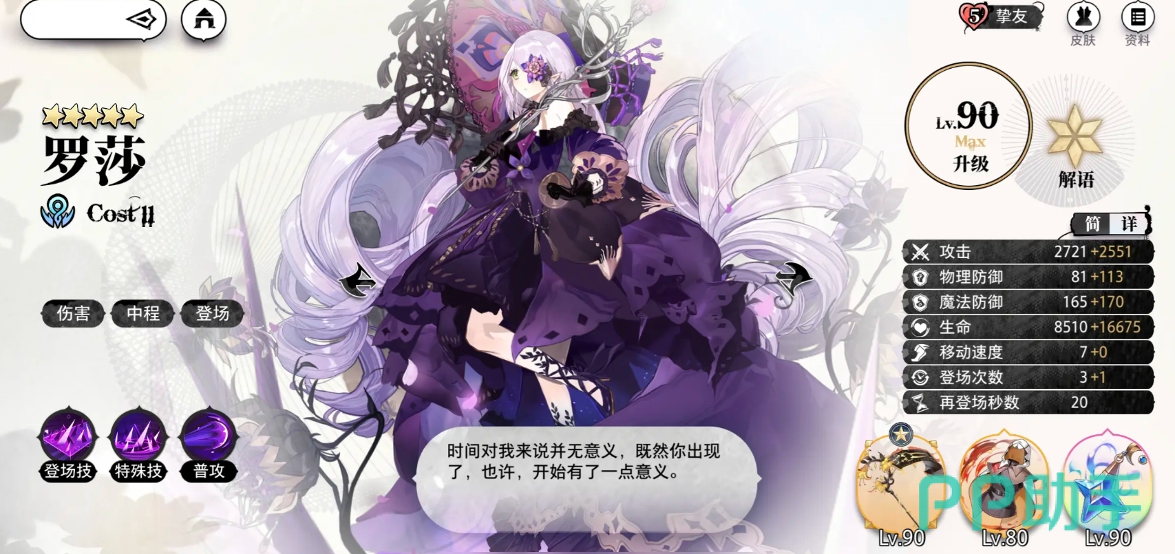 输出方面,维奥莱(雷法)表现突出,其感电状态叠加后可触发群体眩晕,配合专武能无视防御打出高额伤害。罗莎对召唤单位有额外伤害加成,二解后增伤无上限,清场效率极高。辅助角色推荐洛忒斯,其法阵可在固定区域持续回复队友生命值;后期可替换为布蕾蒂,提供护盾与增伤效果,进一步提升队伍的续航与爆发力。