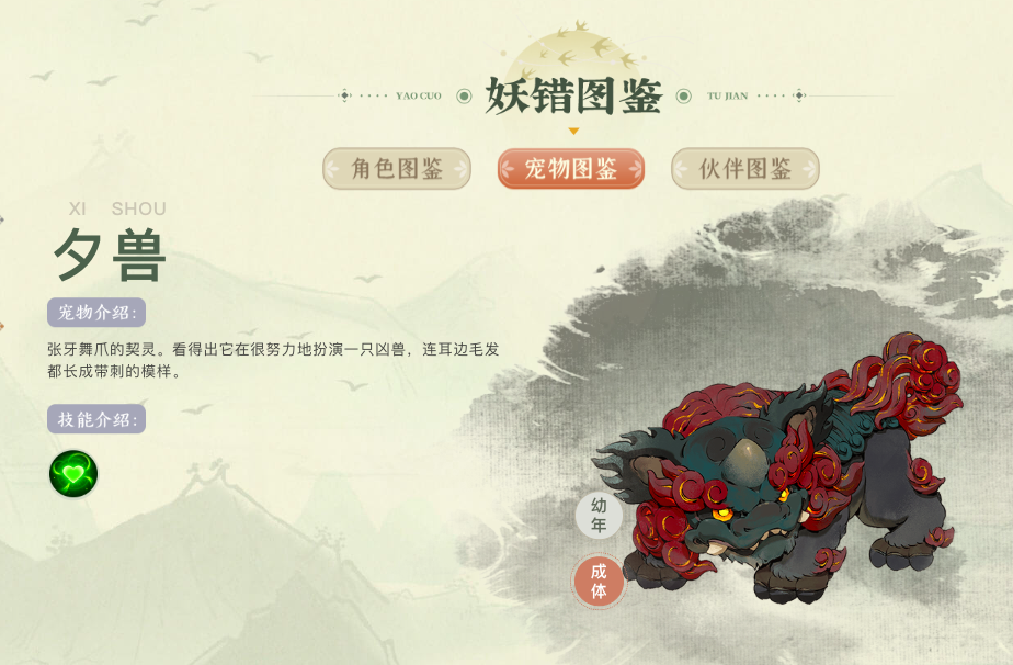夕兽——团队续航型四足灵兽,取材自《山海经·海外西经》“状如舞狮,赤鬃墨脊,群居则威压百里”。幼体红鬃金铃,形似传统年俗瑞兽;成体褪色为墨绿鳞甲,额生螺旋骨刺。刷新于瘴气浓度≥40%的原始丛林带,具备天然【群慑】特性:进入战斗时自动对半径15米内所有敌方单位施加1.5秒僵直。主动技能【夕照回春】可为目标及周围3名队友恢复12%最大生命值,并附加“余晖护盾”,吸收相当于施法者25%攻击力的伤害,持续6秒。该灵兽培养优先级建议置于中后期团队配置阶段。