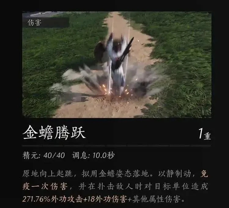 这个技能在使用时,可以模拟金蟾的姿态,来更好的击退敌人,除此之外,还可以造成外伤攻击以及其他属性的伤害,只用扑击攻击时,关于点击目标人物来进中,并且还可以触发发生后退的效果,还有连续扑击可以连续性的打出两次扑击的伤害,每一次扑击都会消耗15点的精元值,并且还有毒效,或许还有第三段技能从高跳下,来砸中目标。