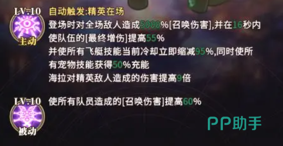 除增伤外,该技能还具备双重技能加速效果:一是令所有飞艇技剩余冷却时间缩减95%,实现近乎瞬发重置;二是为全体宠物技额外充能50%。此外,当海拉自身攻击精英单位时,伤害提升至原始值的9倍,大幅强化其单点压制能力。