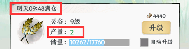 (3)洞府灵田产能需科学配比,确保【灵谷】产量≥0;其余产能按需分配至灵木、灵髓等资源;所有仓库容量上限及满仓时间均在左上角实时显示,超量将自动停产,请及时收取