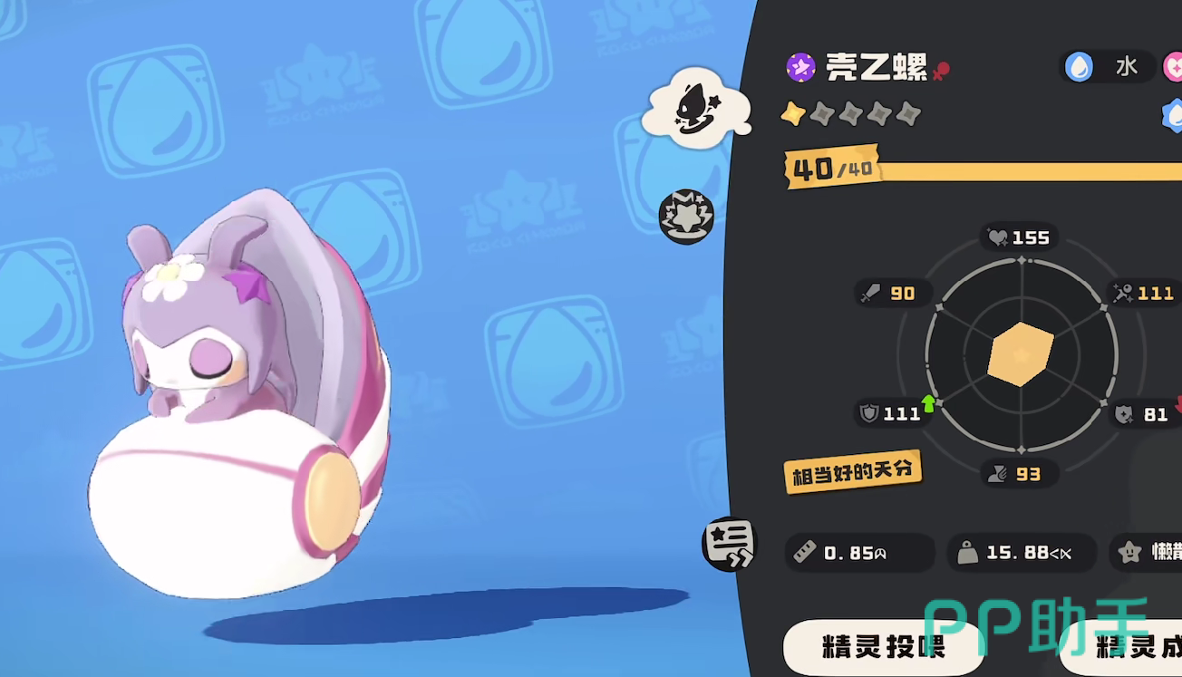 壳乙螺在游戏当中定位为水属性精灵,作为辅助角色,它有极高的双防属性,物理防御和魔法防御在初始阶段,高达八十点,在进化成为卡洛儿之后,基础的物理防御可以达到124点,魔法防御为112点。