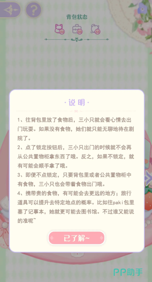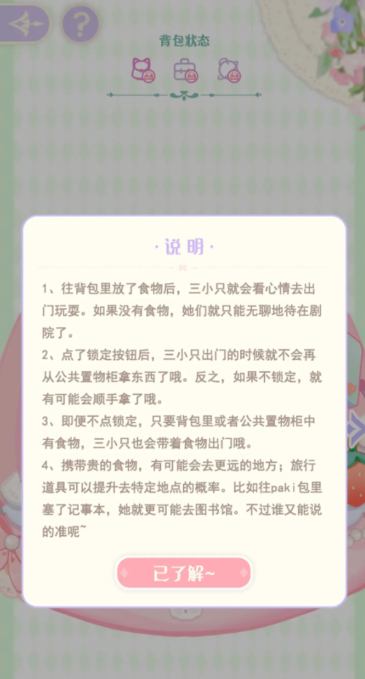 小背包也就是三个角色的背包,这个背包里的所有东西都需要玩家来帮忙收拾,无论是背包里装旅行的道具还是装各种食物都需要玩家自己来决策,因为三个小演员的特色各不相同,爱好也不一样,擅长的表演也不同,所以每次小演员出门之前玩家都要根据演员的不同来收拾不同的背包,无论是小背包的外观还是里面的物品都要满足小演员的需要。