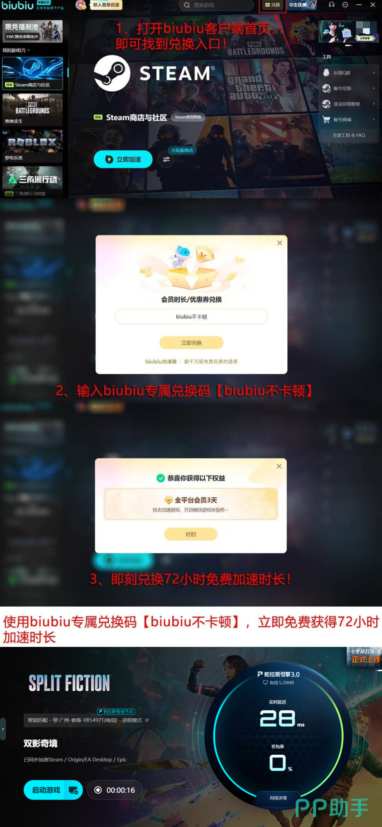 新用户首次注册后,即可领取24小时全功能加速时长;所有账号还享有通用3天试用权限,兑换码【biubiu不卡顿】可在平台内“福利中心”直接使用。
