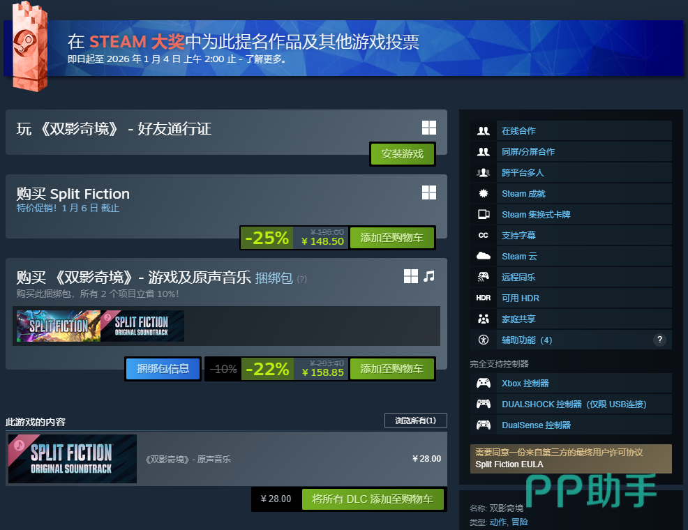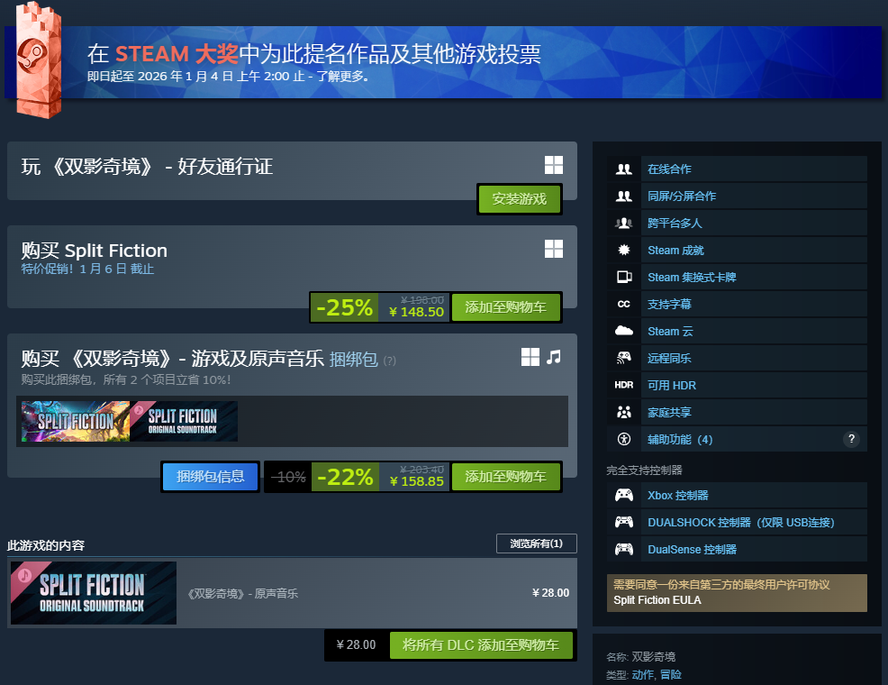 Steam平台年度大型促销——冬季特卖已全面开启,《双影奇境》迎来发售以来最低价:148.5元。本次折扣活动将持续至1月6日,覆盖全区域用户,支持中文界面与全程语音,是入手该作性价比最高的窗口期。