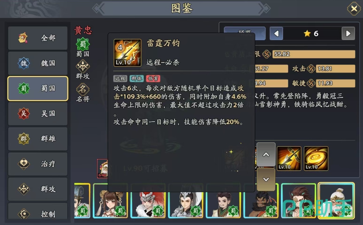 得益于这一机制,黄忠能够在战斗初期迅速完成状态构建,随后持续享受高额伤害加成、减伤以及怒气回复优势。他的主动技能【平地风雷】为单体远程攻击,附带额外暴击率加成,在被动加持下具备极强的点杀能力。而其必杀技【雷霆万钧】则是典型的群体打击手段——连续发动6次随机目标攻击,并基于自身最大生命值的一定比例附加额外伤害。需要注意的是,若多次命中同一单位,后续伤害将会递减。