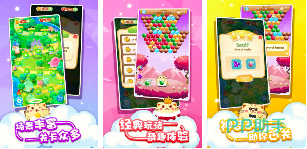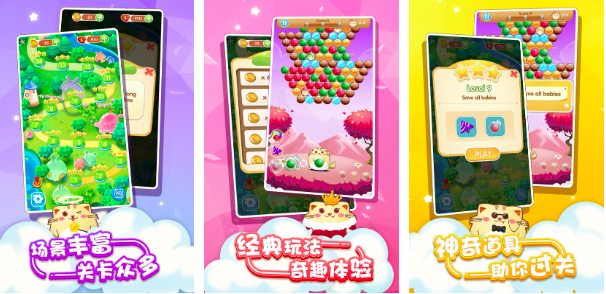 泡泡龙这种消除游戏相当经典,这款开心萌猫泡泡龙,不仅对经典玩法再度复刻,还加入了很多奇葩的爆炸特效,以及独特的消除玩法,为玩家解锁更多欢乐。辅助线系统,可以帮助玩家更加精准的进行泡泡发射。除此之外,游戏设计四种道具,对于手残党玩家来说,通关难度大大降低。丰富的场景地图,带来独一无二的视觉体验。